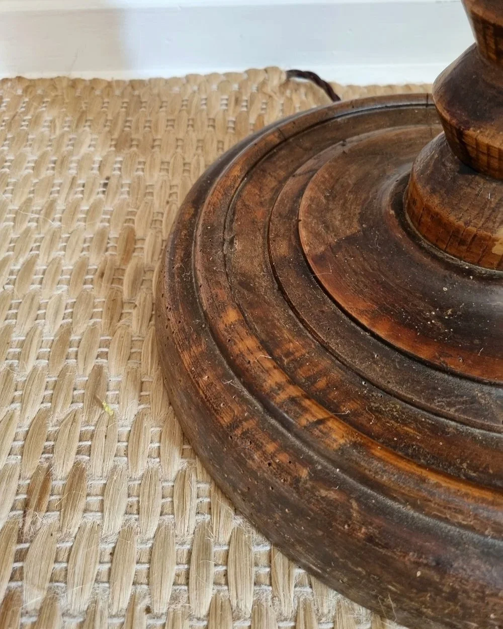 In vintage condition, visible signs of wear and age. Wood stain has worn off in many areas, especially lower central column. Evidence of historical woodworm.