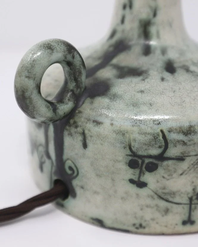 Beautiful and rare small, midcentury pale blue / grey ceramic table lamp by French ceramicist, Jacques Blin (1920-1995). Hand engraved with illustrations of bulls (taurus) and signed to base. Circa 1950-60s. In perfect condition and in working order. See video below!